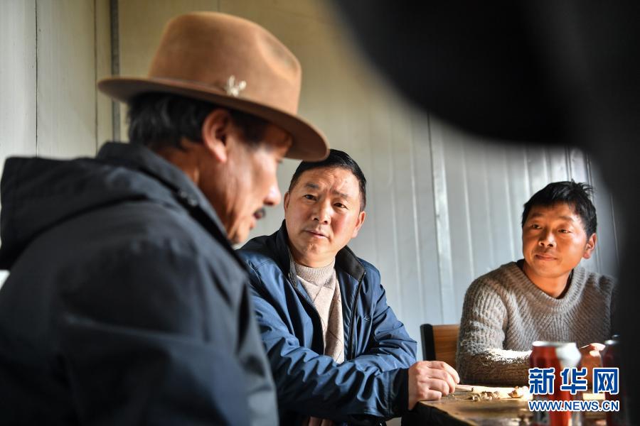陳千(中)和甲日卡村黨支部書記多多(左)及溫室大棚種植戶共同商討溫室種植細(xì)節(jié)(2月25日攝)。新華社記者 晉美多吉 攝