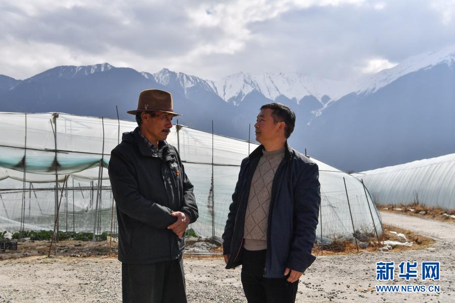 陳千(右)和甲日卡村黨支部書記多多在溫室前商討怎樣促進(jìn)村民增收(2月25日攝)。新華社記者 晉美多吉 攝