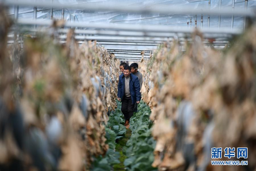 陳千(中)和種植戶在大棚里查看蔬菜長勢(2月25日攝)。新華社記者 晉美多吉 攝