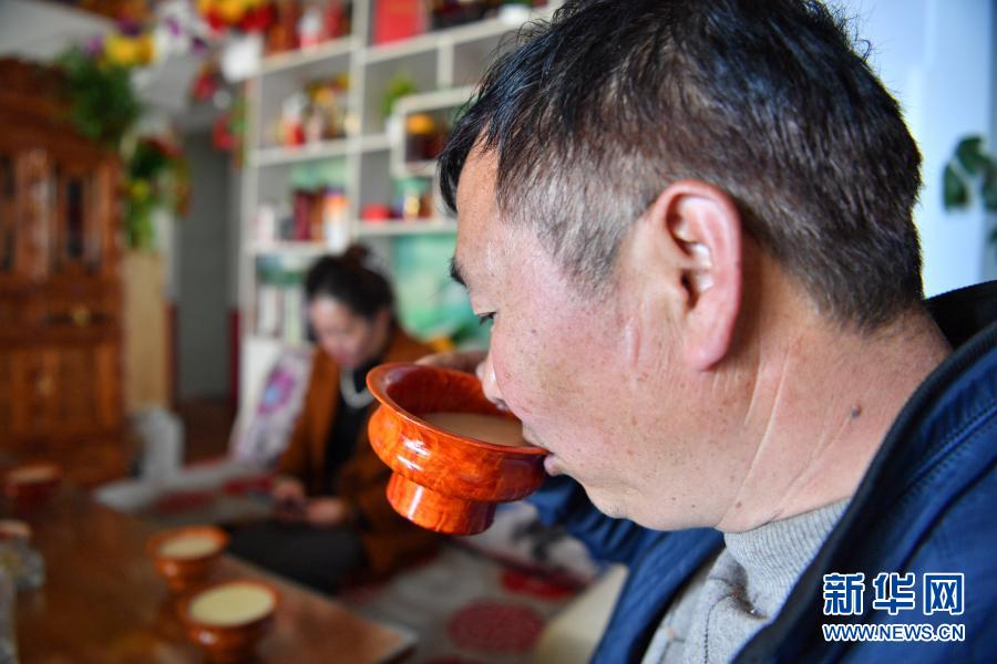 陳千在喝妻子為他打的酥油茶(2月25日攝)。新華社記者 晉美多吉 攝