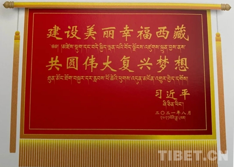習(xí)近平總書(shū)記題詞的“建設(shè)美麗幸福西藏 共圓偉大復(fù)興夢(mèng)想”賀匾