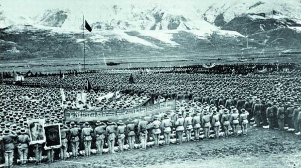 圖為修建進(jìn)藏公路的部隊進(jìn)行動員大會。圖片來源:人民網(wǎng)