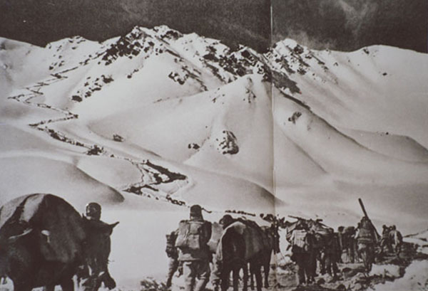 圖為進(jìn)藏部隊過冰河、翻雪山,奮勇前進(jìn)。翻拍:李元梅
