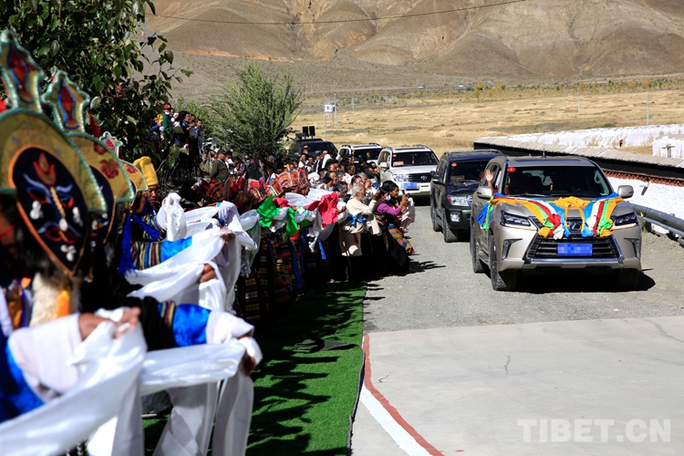沿途農(nóng)牧區(qū)的信教群眾聞?dòng)嵡皝?身著傳統(tǒng)節(jié)日盛裝、手捧潔白哈達(dá),隊(duì)伍綿延數(shù)里,虔誠(chéng)迎候班禪的到來。每當(dāng)遇到前來迎接的信教群眾,班禪便示意車輛緩行,開窗向信眾揮手致意,氣度不凡又格外親切。