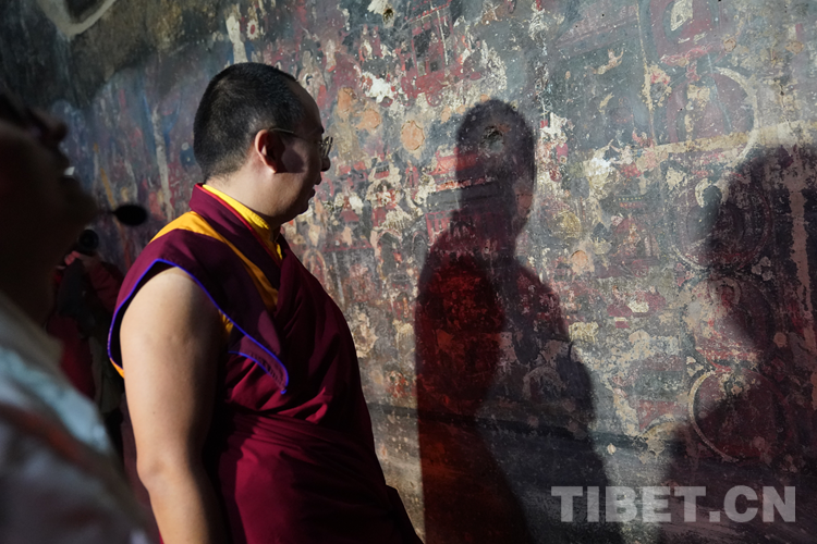 圖為班禪在法王殿內(nèi)觀摩古老壁畫 攝影:王淑