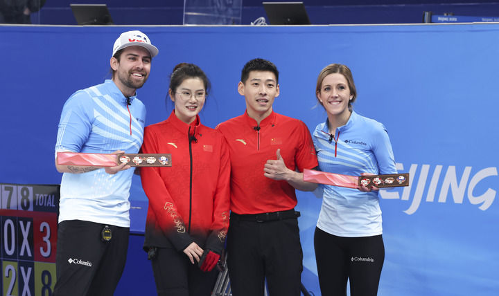 在2月5日比賽中,中國冰壺混雙組合凌智和范蘇圓不敵美國組合維多利亞·珀辛格和克里斯托弗·普利斯。賽后,凌智和范蘇圓向?qū)Ψ劫?zèng)送“冰墩墩”奧運(yùn)紀(jì)念徽章。美國選手驚喜接過禮物。四人合影留念。