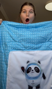 美國運(yùn)動(dòng)員展示“冰墩墩”毯子(網(wǎng)絡(luò)視頻截屏)