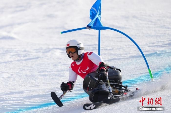 3月10日,中國選手梁子路比賽中。當(dāng)日,北京2022年冬殘奧會殘奧高山滑雪男子大回轉(zhuǎn)-坐姿決賽在延慶國家高山滑雪中心舉行,中國選手梁子路以2分00秒92的成績摘得銅牌。 中新社記者 楊華峰 攝
