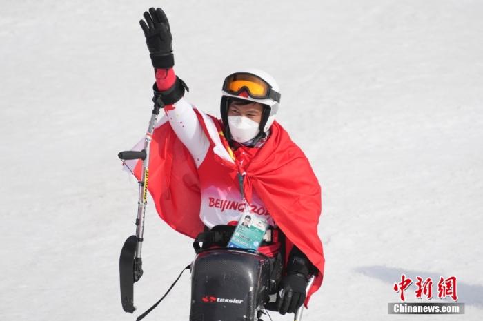 3月10日,中國選手梁子路揮手致意。當(dāng)日,北京2022年冬殘奧會殘奧高山滑雪男子大回轉(zhuǎn)-坐姿決賽在延慶國家高山滑雪中心舉行,中國選手梁子路以2分00秒92的成績摘得銅牌。 中新社記者 楊華峰 攝