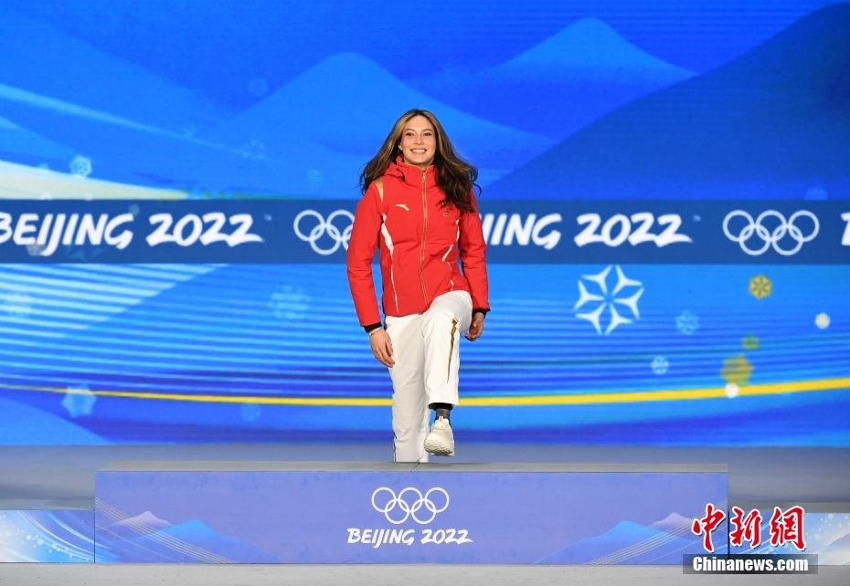2月8日晚,北京冬奧會(huì)自由式滑雪女子大跳臺(tái)頒獎(jiǎng)儀式在北京頒獎(jiǎng)廣場(chǎng)舉行。圖為獲得冠軍的中國(guó)選手谷愛(ài)凌在頒獎(jiǎng)儀式上。 中新社記者 李駿 攝
