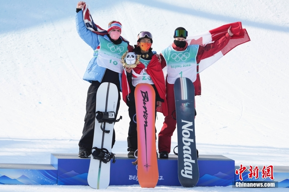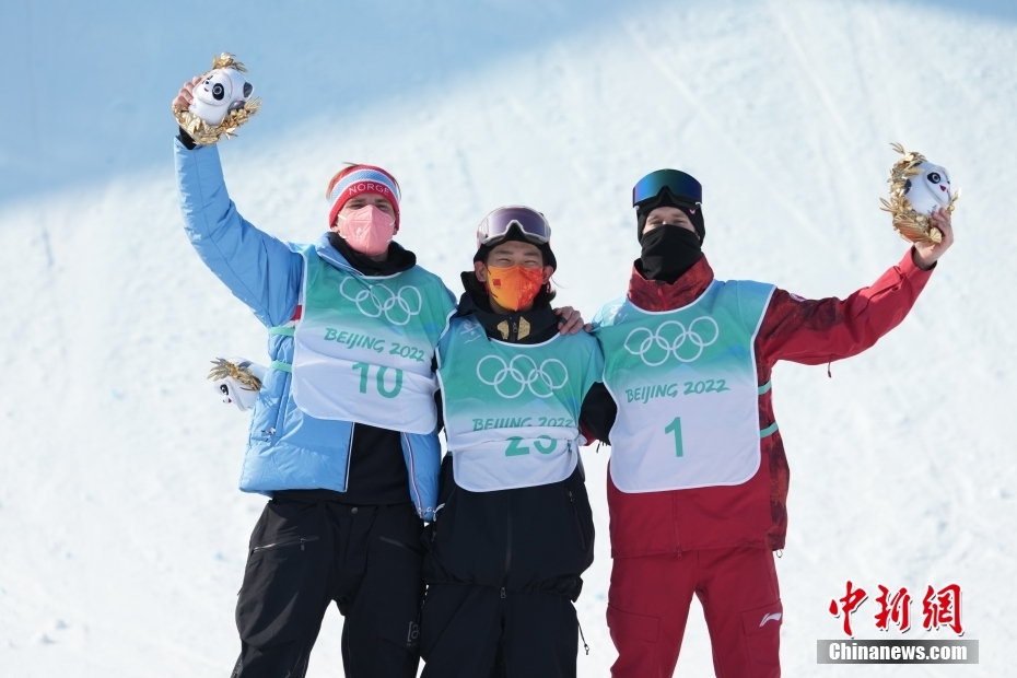 2月15日,北京2022年冬奧會單板滑雪男子大跳臺決賽在首鋼滑雪大跳臺舉行,中國選手蘇翊鳴(中)獲得冠軍,挪威選手蒙斯·勒伊斯韋蘭 (左)獲得亞軍,加拿大選手馬克斯·帕羅特(右)獲得季軍。圖為頒發(fā)紀念品儀式。 中新社記者 毛建軍 攝