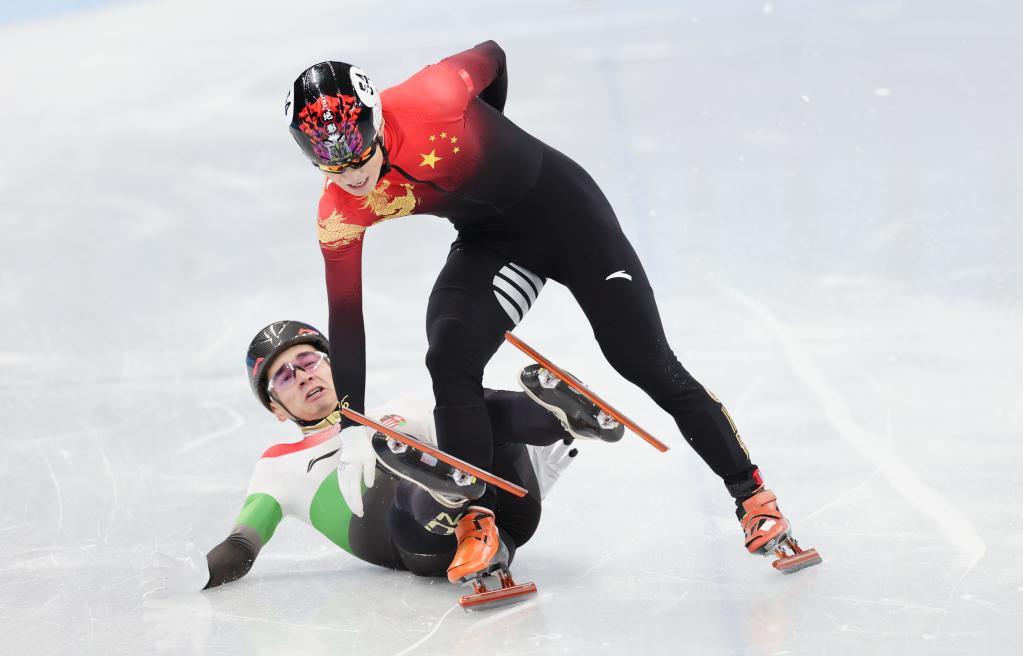 2月7日,中國(guó)隊(duì)選手任子威(上)與匈牙利隊(duì)選手劉少林在短道速滑男子1000米決賽中沖線后。新華社記者蘭紅光攝