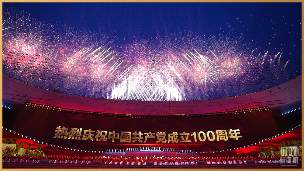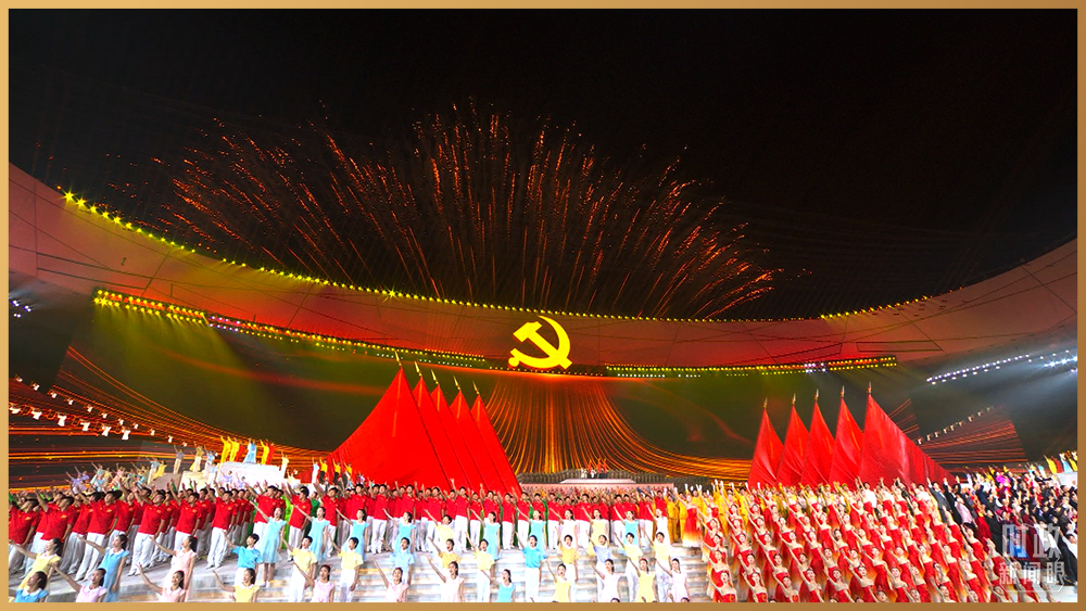 情景交響歌舞《人民至上》,再現(xiàn)舉國(guó)動(dòng)員、全民戰(zhàn)“疫”。鼓樂(lè)歌舞節(jié)目《新的天地》,一百面空中大鼓與地面巨型大鼓遙相呼應(yīng)。在主題曲《領(lǐng)航》的旋律中,高達(dá)16米的金色黨徽在國(guó)家體育場(chǎng)莊嚴(yán)升起。演出過(guò)程中,絢爛的焰火一次次盛放在國(guó)家體育場(chǎng)上空,并迅速在網(wǎng)上引發(fā)刷屏。