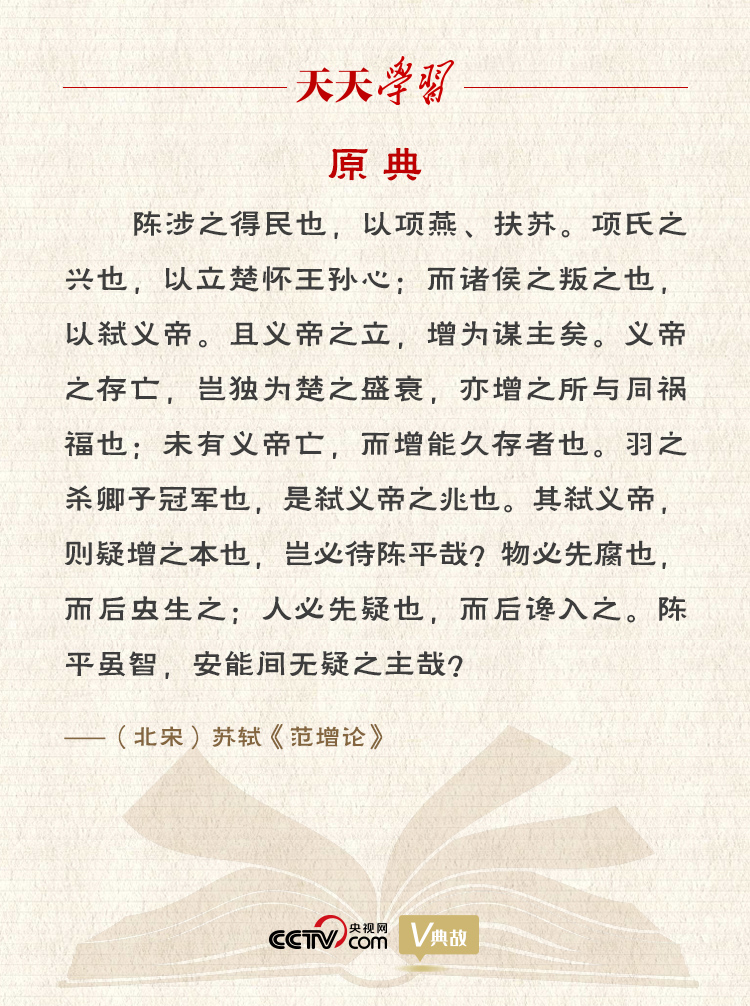 《范增論》是蘇軾早期的一篇史論文章,收錄在《古文觀止》卷十。文中蘇軾針對(duì)陳平用計(jì)離間項(xiàng)羽和范增的觀點(diǎn),翻空出奇,立意新穎地提出:“物必先腐也,而后蟲(chóng)生之;人必先疑也,而后讒入之?!弊髡叽蛄藗€(gè)比方,東西總是自身先腐爛,然后蟲(chóng)子才會(huì)寄生,說(shuō)明事物總是自己先有弱點(diǎn)然后才為外物所侵。指出正是由于項(xiàng)羽生性多疑,聽(tīng)信讒言,才被敵人利用,從而招致慘敗。