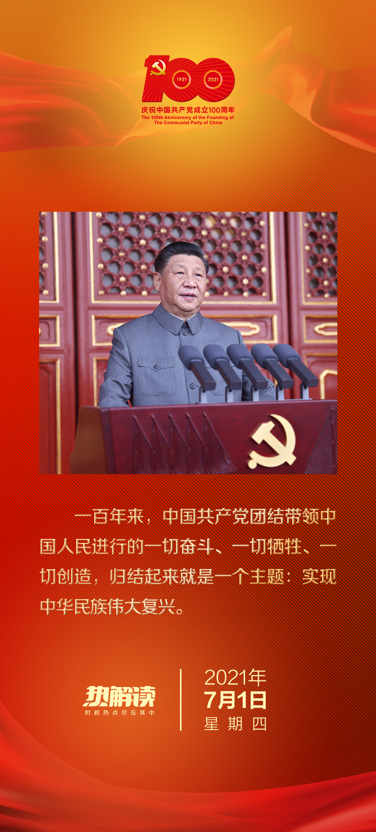 “一百年來,中國(guó)共產(chǎn)黨團(tuán)結(jié)帶領(lǐng)中國(guó)人民進(jìn)行的一切奮斗、一切犧牲、一切創(chuàng)造,歸結(jié)起來就是一個(gè)主題:實(shí)現(xiàn)中華民族偉大復(fù)興?!绷?xí)近平總書記的精辟論述,高度概括了中國(guó)共產(chǎn)黨百年歷史。