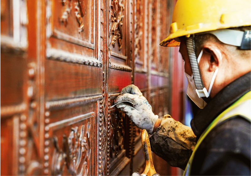 位于上海市興業(yè)路76號的中共一大會址紀(jì)念館實施修繕改造。圖為2021年3月22日,工人在清理木質(zhì)雕花板?!⌒氯A社記者 劉穎/攝