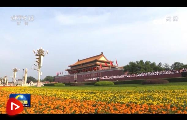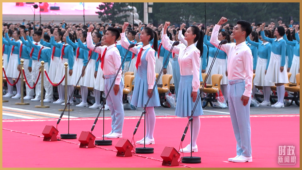 8點(diǎn)整,慶祝大會(huì)開始。100響禮炮響徹云霄?,F(xiàn)場(chǎng)升國(guó)旗、奏唱國(guó)歌。此后,各民主黨派、工商聯(lián)和無(wú)黨派人士聯(lián)合致賀詞,由共青團(tuán)員和少先隊(duì)員組成的千人方陣集體致獻(xiàn)詞。