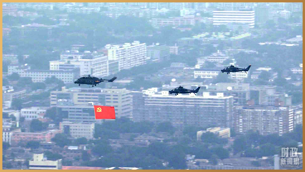 直升機(jī)懸掛鮮紅的中國(guó)共產(chǎn)黨黨旗飛過(guò)。