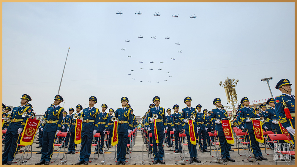 29架直升機(jī)組成“100”字樣掠過(guò)長(zhǎng)空。(總臺(tái)記者廖江衡拍攝)