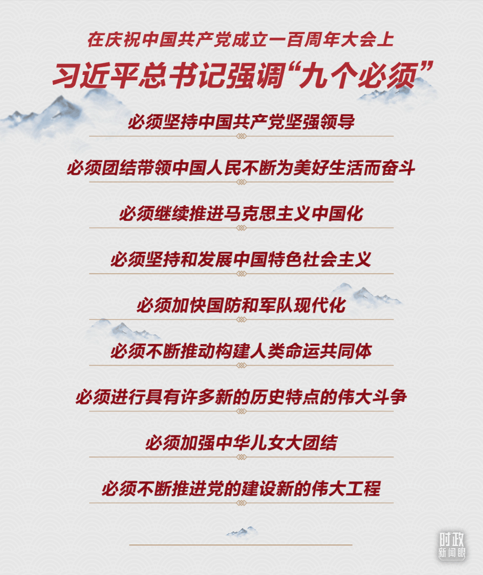 在7月1日的慶祝中國(guó)共產(chǎn)黨成立100周年大會(huì)上,習(xí)近平強(qiáng)調(diào),我們要用歷史映照現(xiàn)實(shí)、遠(yuǎn)觀未來(lái),從中國(guó)共產(chǎn)黨的百年奮斗中看清楚過(guò)去我們?yōu)槭裁茨軌虺晒?、弄明白未?lái)我們?cè)鯓硬拍芾^續(xù)成功。以史為鑒、開創(chuàng)未來(lái),總書記提出“九個(gè)必須”,并作出許多新論斷、新表述。
