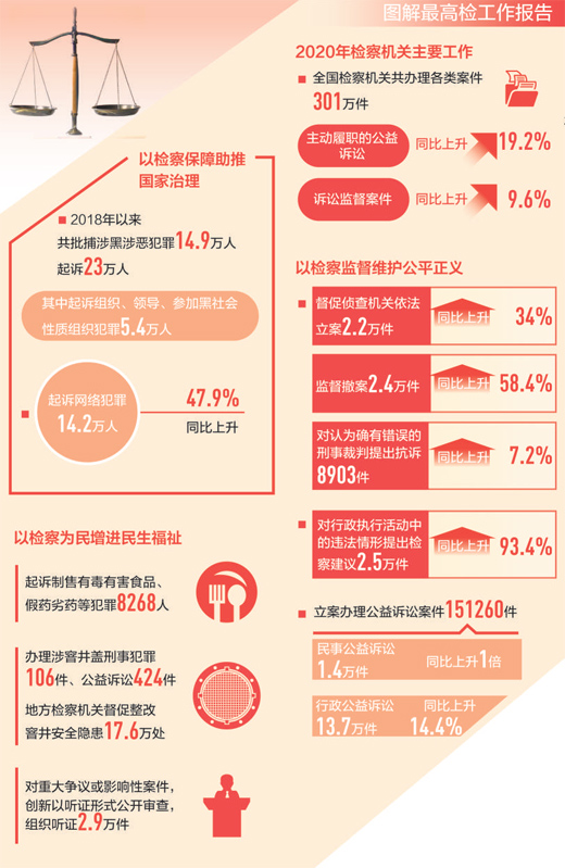 2020年,刑事檢察更加有力,民事檢察更為精準(zhǔn),行政檢察持續(xù)做實(shí),公益訴訟檢察有序拓展,檢察機(jī)關(guān)在嚴(yán)格依法履職中促進(jìn)社會(huì)公平正義。