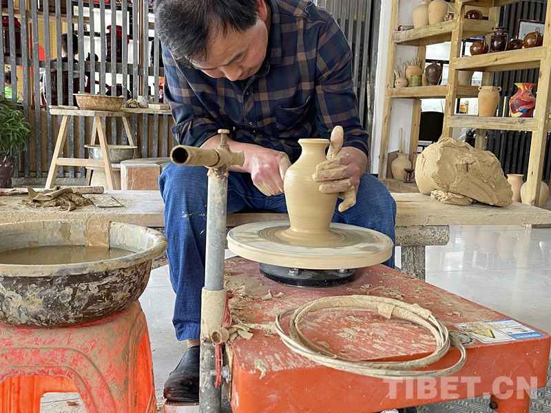 花茂村的土陶制作有著140多年的歷史,53歲的母先才是家族制陶的第四代傳人,也是土陶非遺文化傳承人。在母先才的陶藝體驗(yàn)館里,擺放著各種成品,供游客觀摩、選購,還有數(shù)十臺(tái)拉坯機(jī),供游客或?qū)W徒們使用。