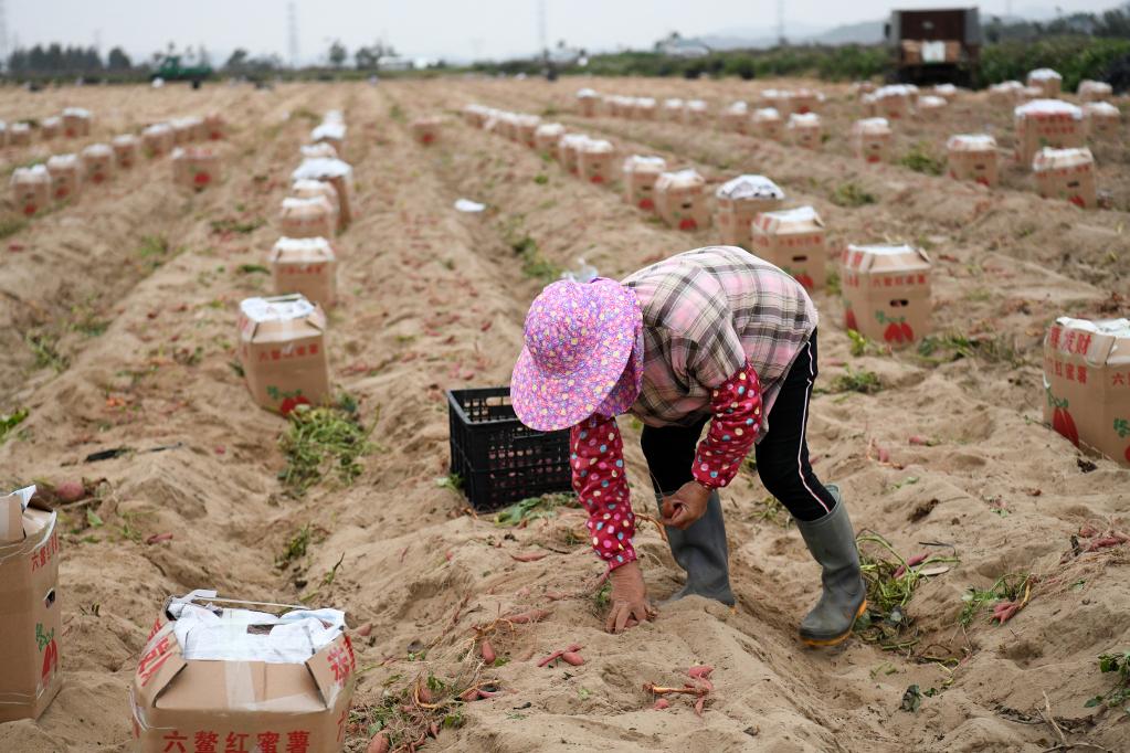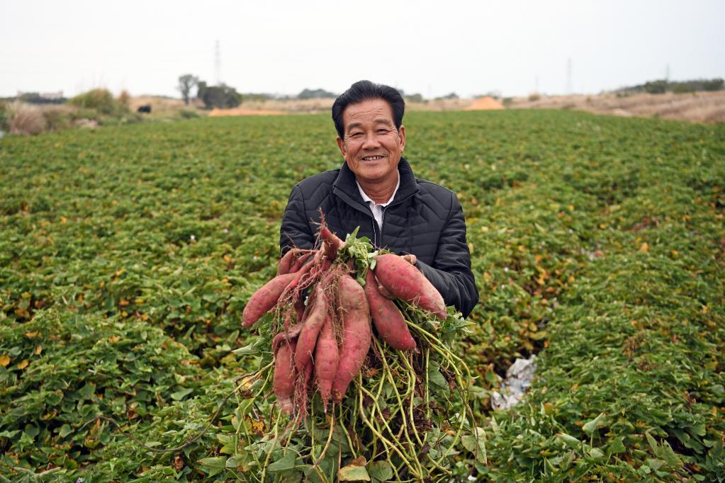 2月9日,陸豐市碣石鎮(zhèn)戴厝村村民戴勝友在田里收獲甘薯。新華社記者梁旭 攝