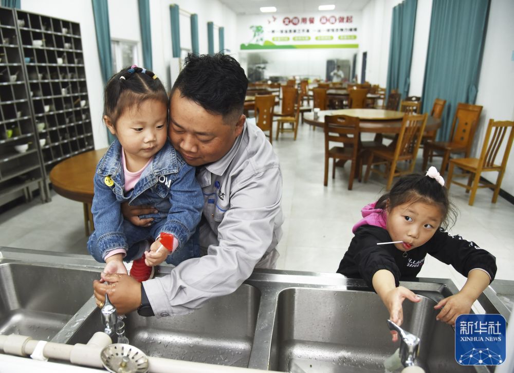 從施工現(xiàn)場回來,楊興義在食堂為小女兒洗手(1月24日攝)。新華社記者田建川攝