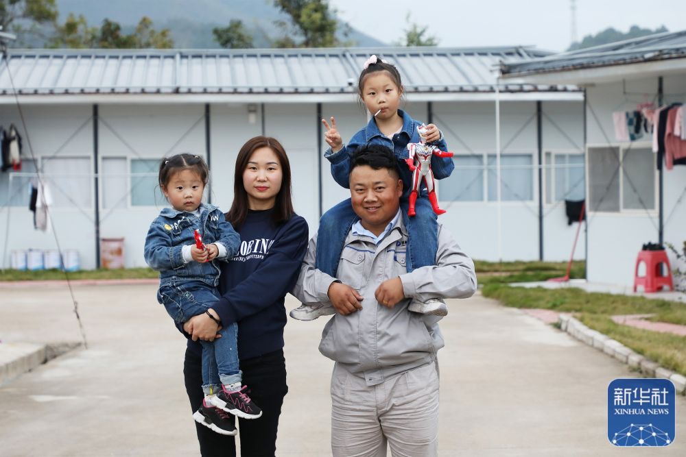 楊興義一家四口在板房宿舍前合影(1月25日攝)。新華社記者王瑞平攝