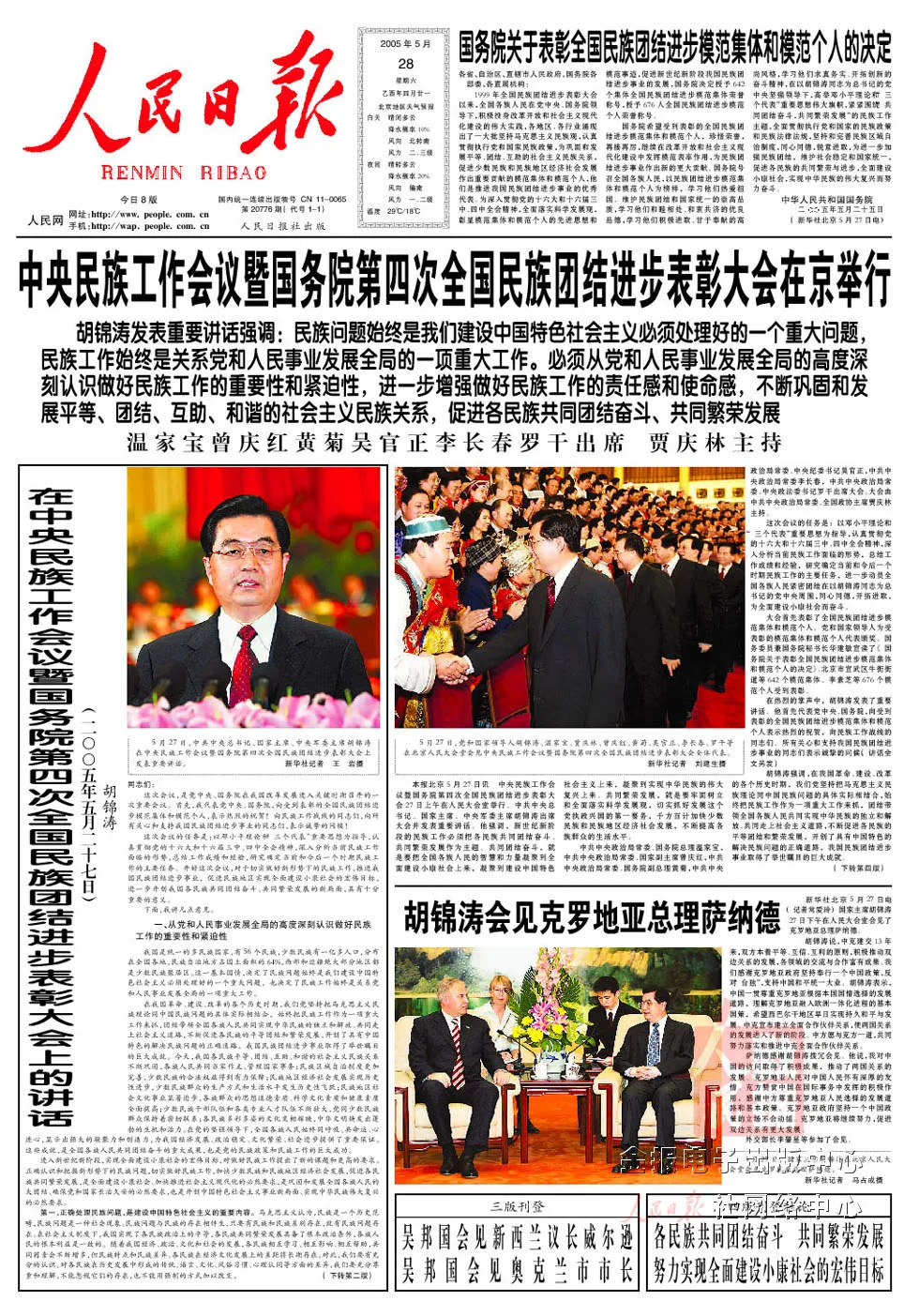 2005年5月27日至28日,第三次中央民族工作會(huì)議暨國(guó)務(wù)院第四次全國(guó)民族團(tuán)結(jié)進(jìn)步表彰大會(huì)在北京召開(kāi)。