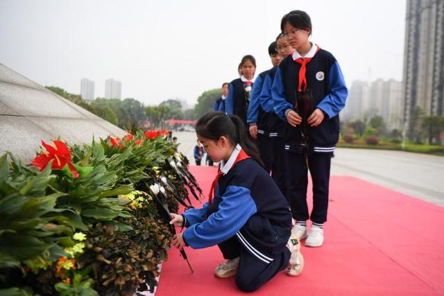 3月30日,長(zhǎng)沙市長(zhǎng)郡天心實(shí)驗(yàn)學(xué)校學(xué)生在湖南革命陵園烈士紀(jì)念碑前敬獻(xiàn)鮮花。