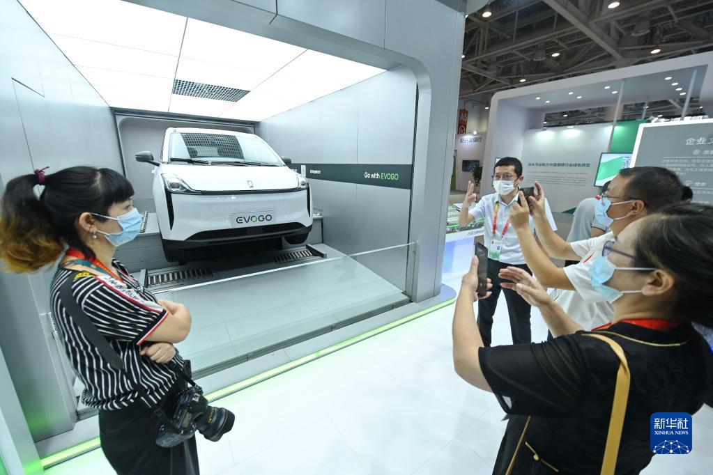在福建廈門舉行的第二十二屆中國國際投資貿(mào)易洽談會的寧德時代展位,來訪者參觀新能源汽車換電過程(2022年9月8日攝)。新華社記者 林善傳 攝