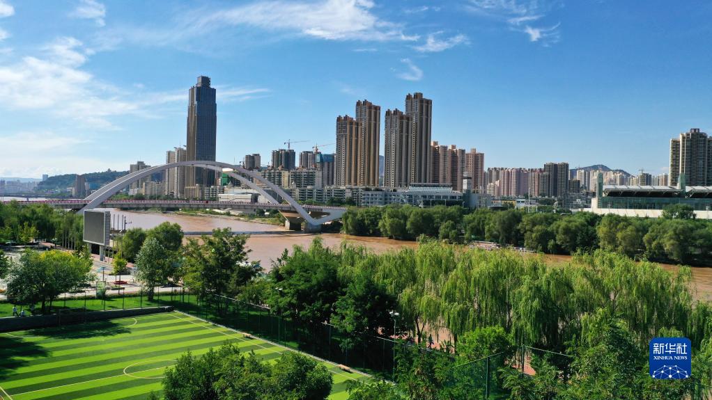 這是黃河蘭州段城市風(fēng)光(2022年9月5日攝,無人機(jī)照片)。新華社記者 陳斌 攝
