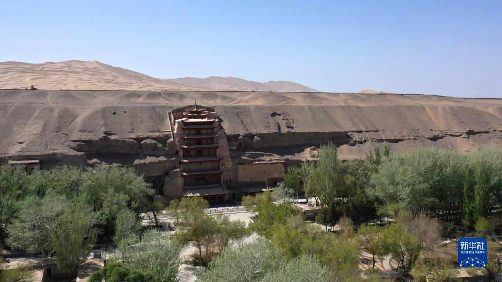這是世界文化遺產(chǎn)莫高窟的標(biāo)志性建筑——第96窟窟外木構(gòu)建筑九層樓(2022年4月18日攝,無人機(jī)照片)。新華社記者 陳斌 攝