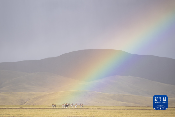 彩虹下的羌塘國(guó)家級(jí)自然保護(hù)區(qū)藏野驢。新華社記者 孫瑞博 攝