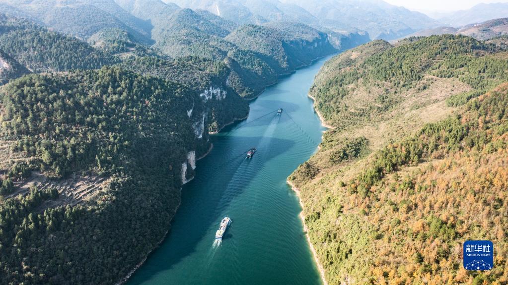 運載磷礦石的貨船沿烏江航道順流航行(2021年11月18日攝,無人機照片)。新華社記者 陶亮 攝