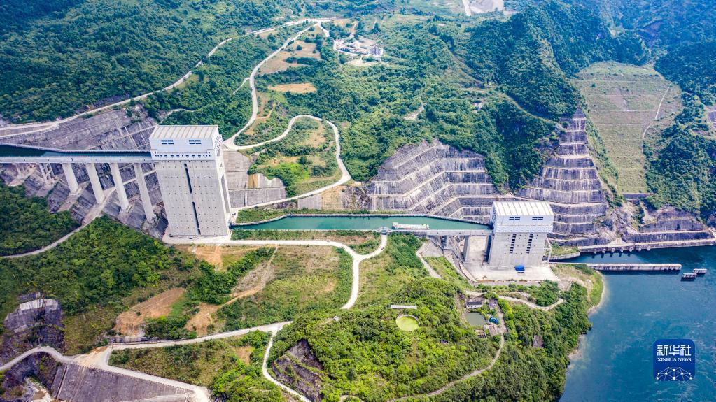 2021年6月投入試運行的構(gòu)皮灘水電站配套的通航工程,被視為貴州通江達海的關(guān)鍵。構(gòu)皮灘通航水頭高差達199米,采用三級垂直升船機運行,船只通過烏江構(gòu)皮灘水電站都要搭乘“水上電梯”,呈現(xiàn)出“水在空中懸,船在天上行”的奇景。
