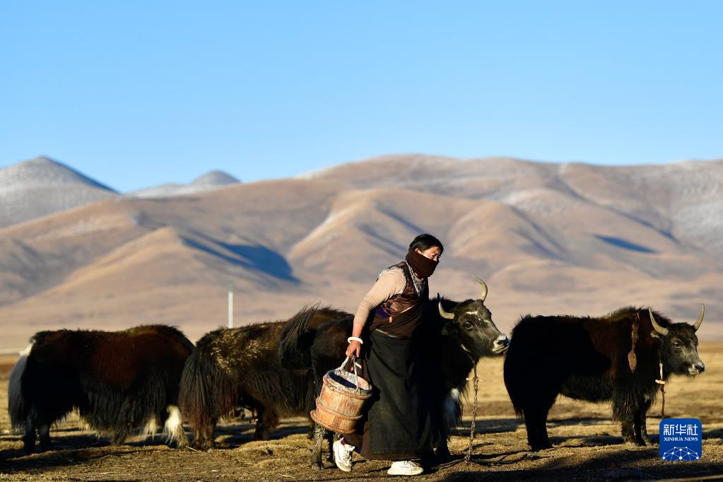 青海省玉樹藏族自治州稱多縣珍秦鎮(zhèn)二村牧民扎西德藏準備給牦牛擠奶(2020年10月28日攝)。新華社記者 張龍 攝