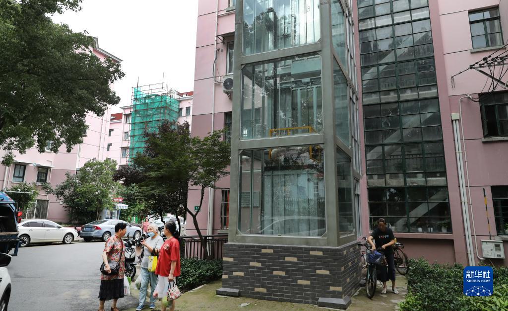 在上海市長寧區(qū)北新涇街道新涇六村,居民在加裝了電梯的12號樓旁聊天(2020年6月23日攝)。新華社記者 方喆 攝