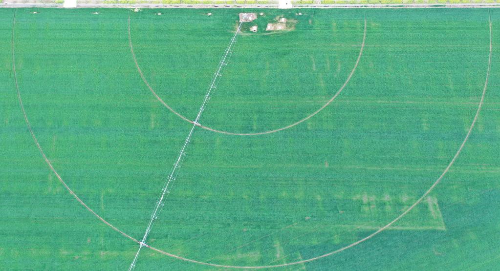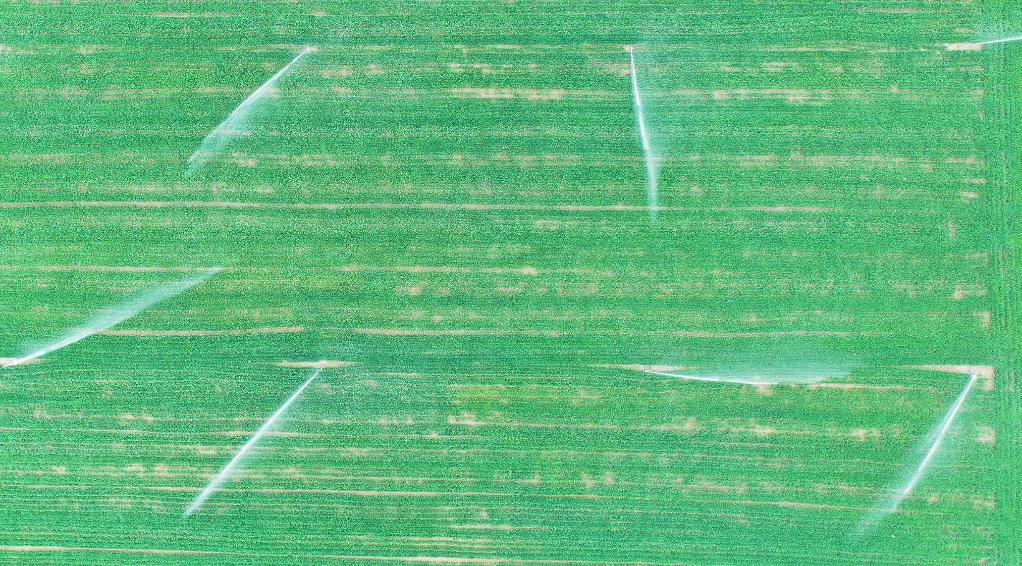 3月22日,商水縣高標(biāo)準(zhǔn)農(nóng)田示范區(qū)內(nèi)正在噴灌作業(yè)的麥田。新華社記者 張浩然 攝