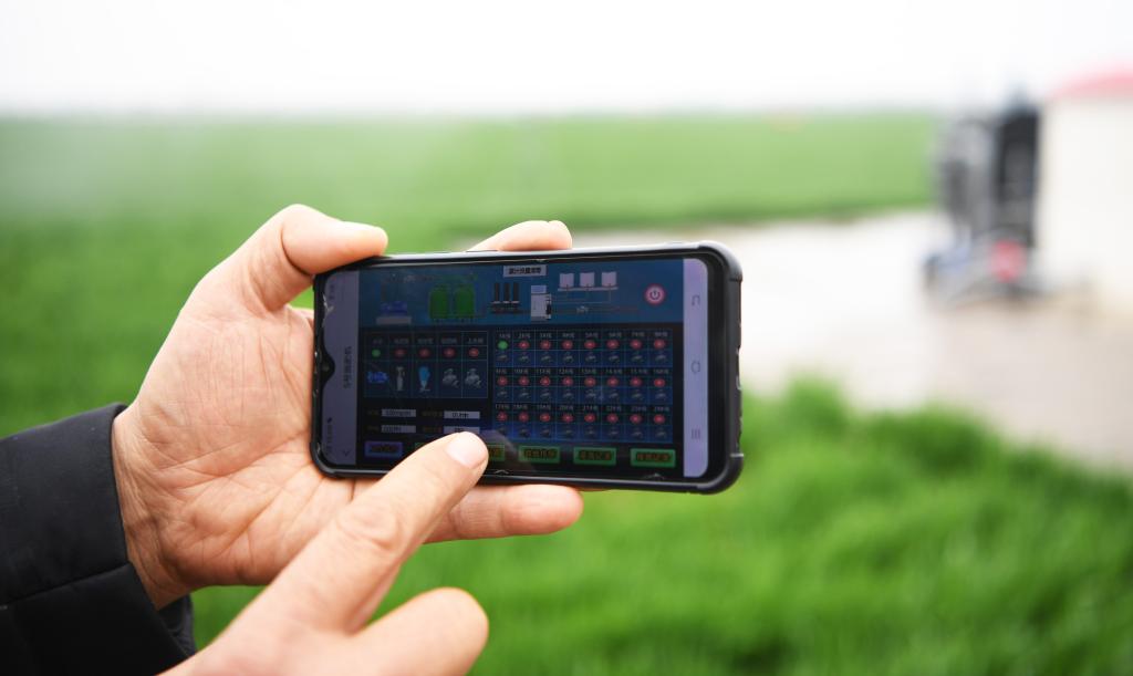 3月22日,種糧大戶邱守先正在使用手機(jī)操控設(shè)備對(duì)麥田進(jìn)行灌溉。新華社記者 張浩然 攝