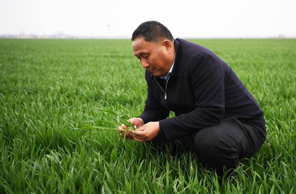 3月22日,種糧大戶劉天華在商水縣高標(biāo)準(zhǔn)農(nóng)田示范區(qū)查看自家小麥長(zhǎng)勢(shì)。新華社記者 張浩然 攝