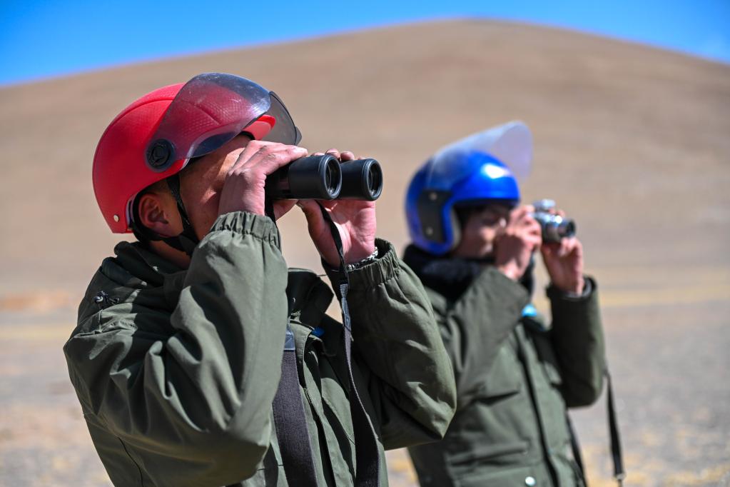 洛桑日達(dá)(左)與隊(duì)友正在觀察野生動物。新華社記者周荻瀟 攝