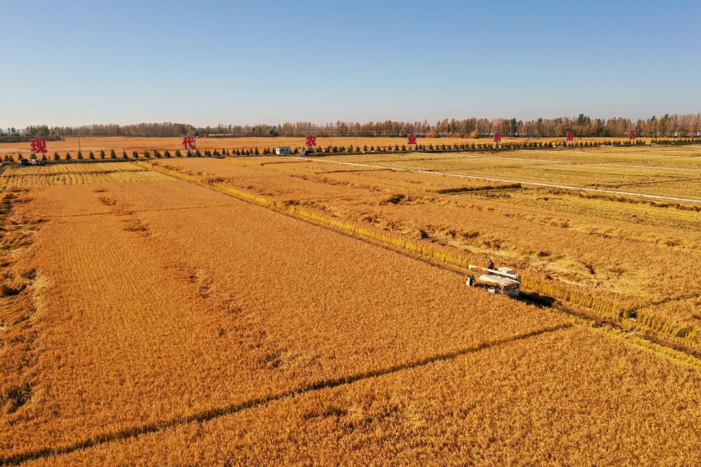 2021年10月12日,在吉林省吉林市永吉縣萬昌鎮(zhèn),農(nóng)民駕駛農(nóng)機(jī)收割水稻(無人機(jī)照片)。新華社記者 張楠 攝