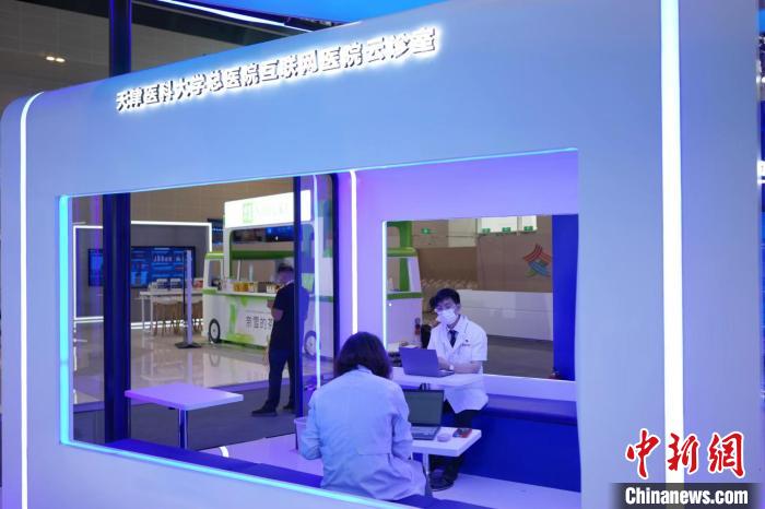 在天津醫(yī)科大學總醫(yī)院展廳,醫(yī)生在“云診室”通過互聯(lián)網(wǎng)醫(yī)院接診患者。記者了解到,在大會上,天津醫(yī)科大學總醫(yī)院宣布與科瑞泰醫(yī)療信息技術(天津)有限公司、360數(shù)字安全集團天津公司、銳捷網(wǎng)絡股份有限公司、中國移動通信集團天津有限公司等開展合作,共同開啟互聯(lián)網(wǎng)醫(yī)院醫(yī)聯(lián)體“1236N”醫(yī)療健康服務新體系的建設之路。