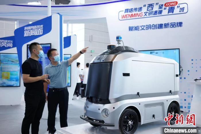 參觀者在天津西青展區(qū)參觀自動駕駛安防巡邏車。 佟郁 攝