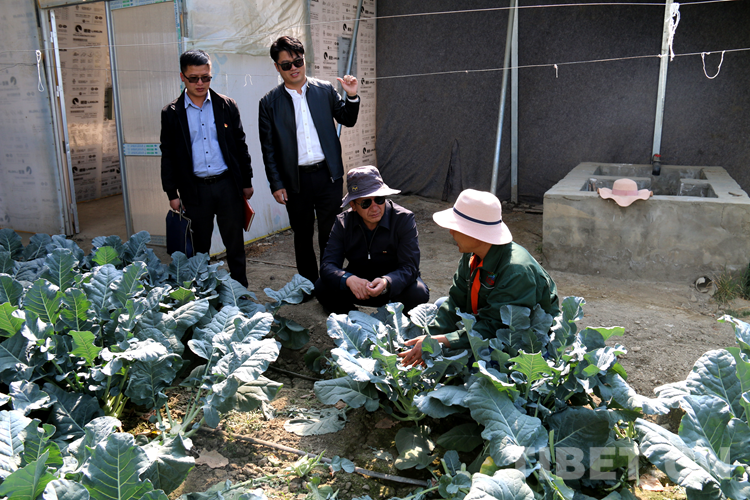 圖為次仁頓珠(左邊第三個(gè)戴灰色太陽帽為次仁頓珠)深入基層了解老百姓溫室菜棚經(jīng)營情況