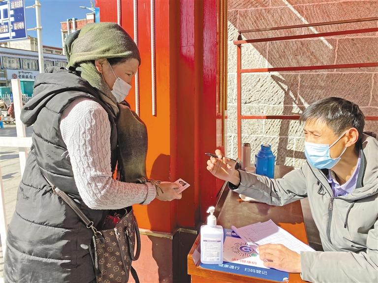 八廓商城市場(chǎng)部部長卓嘎介紹說:“為廣大市民提供一個(gè)安全、祥和的購物環(huán)境,我們?cè)谏虉?chǎng)設(shè)有5個(gè)進(jìn)出口,每個(gè)進(jìn)出口都需掃行程碼、測(cè)量體溫后才可進(jìn)入。因?yàn)橛行├先藳]有智能手機(jī),無法掃健康瑪,我們會(huì)登記姓名、身份證號(hào)、聯(lián)系方式。并且在增加的攤位旁增設(shè)消防器材,不定時(shí)巡邏?!?/p>