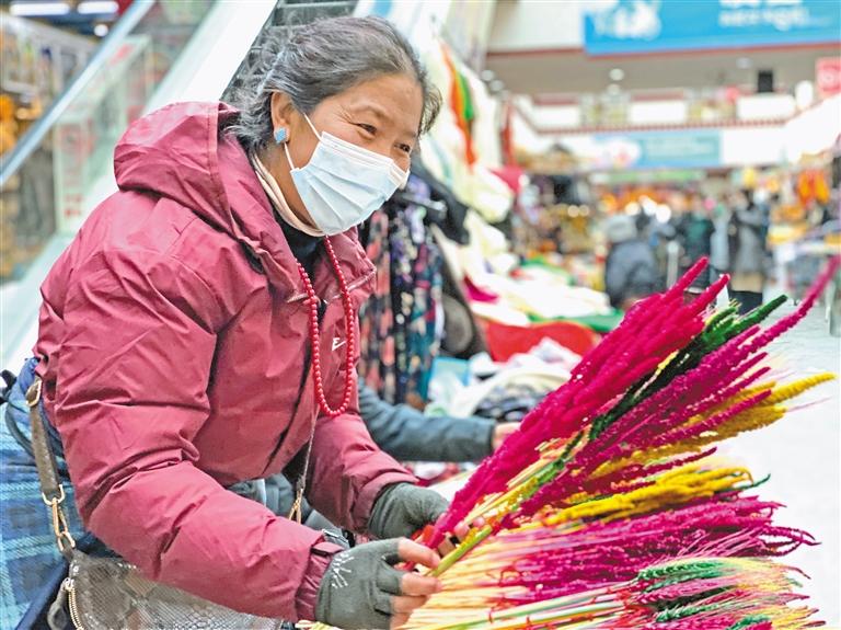 近年來,新春佳節(jié)貼“年紅”的傳統(tǒng)習(xí)俗日漸走進(jìn)圣城雪域。如今,無論城市還是農(nóng)村,幾乎家家戶戶都會(huì)在門上貼藏文春聯(lián),增加喜慶的節(jié)日氣氛。來自墨竹工卡縣的平措卓瑪正在八廓商城年貨攤位前整理著春聯(lián),去年已經(jīng)擺過一次年貨攤位的她,在1個(gè)月的時(shí)間里掙到了8000元?!敖衲陻偽怀楹灂r(shí),心里特別緊張,怕位置不好,沒想到抽到了中間的好位置,這里采光足,紅彤彤的春聯(lián)在陽光下更好看了。新的一年,希望大家幸福安康、平安吉祥!”平措卓瑪懇切地說。