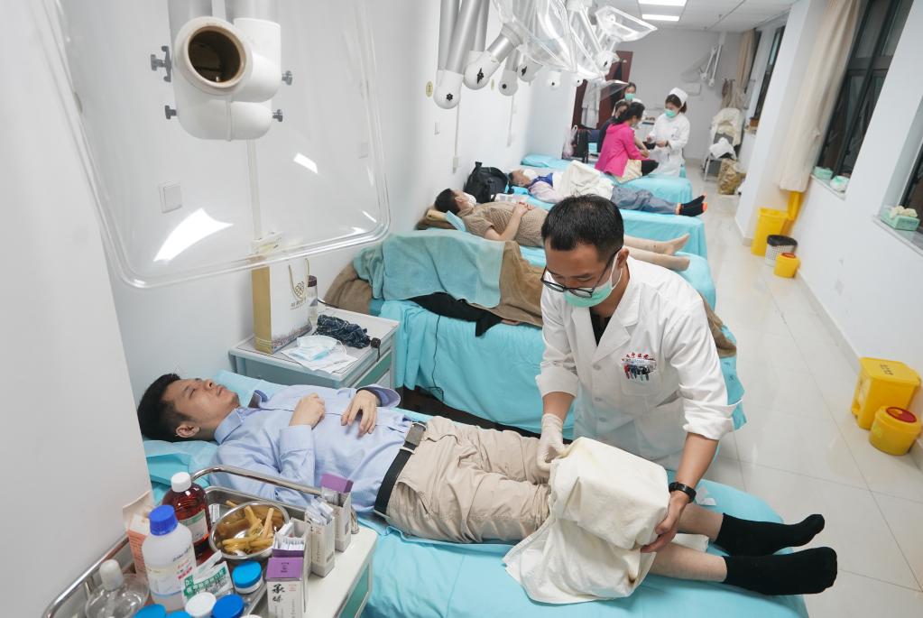 2021年7月11日,寧夏中醫(yī)醫(yī)院暨中醫(yī)研究院治未病中心醫(yī)師在為患者做足底反射療法。新華社記者 馮開華 攝